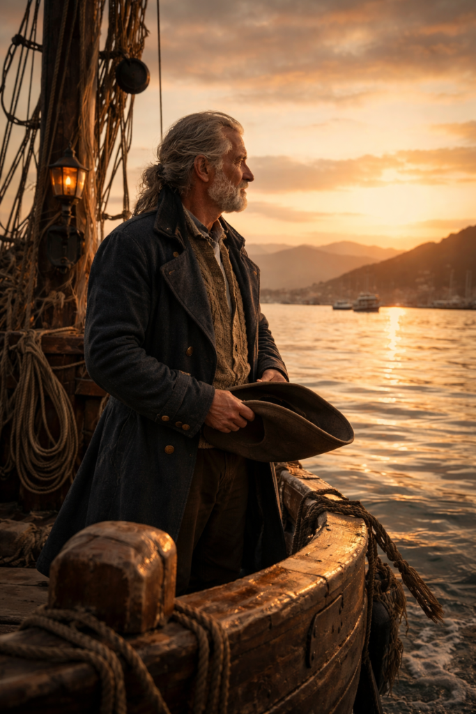 And at the bow stands a captain who no longer needs to prove he can survive.